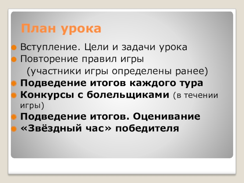 План урокаВступление. Цели и задачи урокаПовторение правил игры  (участники игры определены ранее)Подведение итогов каждого тураКонкурсы с