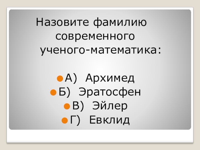 Назовите фамилию      современного    ученого-математика:А) АрхимедБ) ЭратосфенВ)