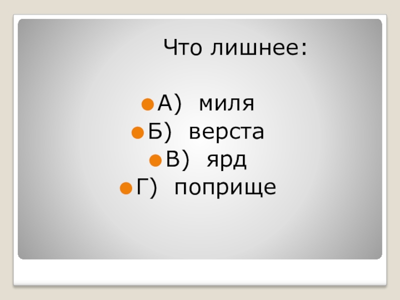 Что лишнее:А) миляБ) верстаВ) ярдГ) поприще