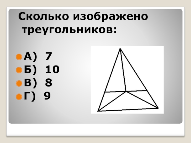 Сколько изображено треугольников:А) 7Б) 10В) 8Г) 9