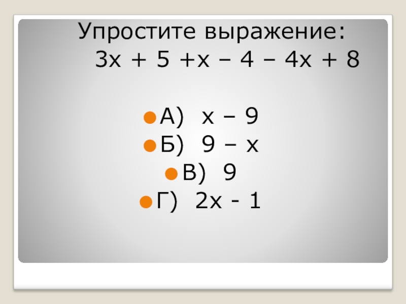 Упростите выражение:    3х + 5 +х – 4 – 4х +