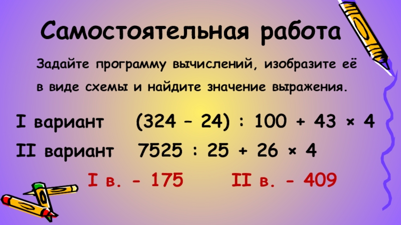 I вариант (324 – 24) : 100 + 43 × 4