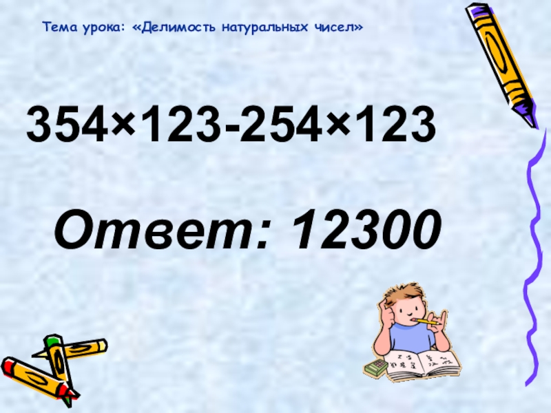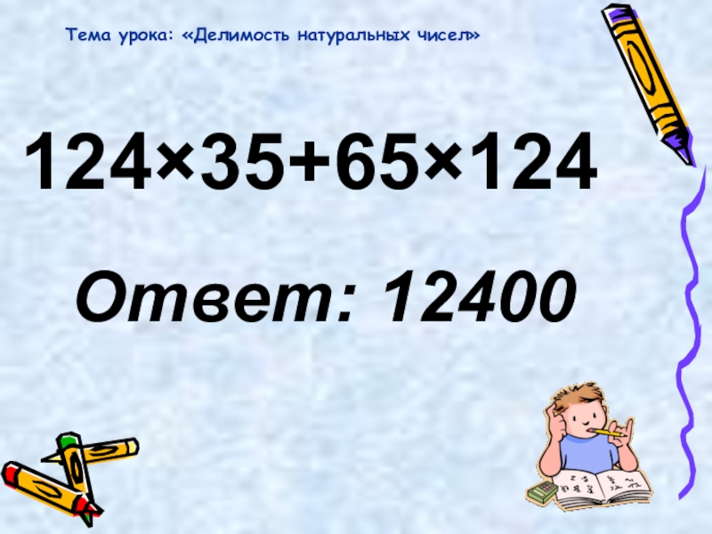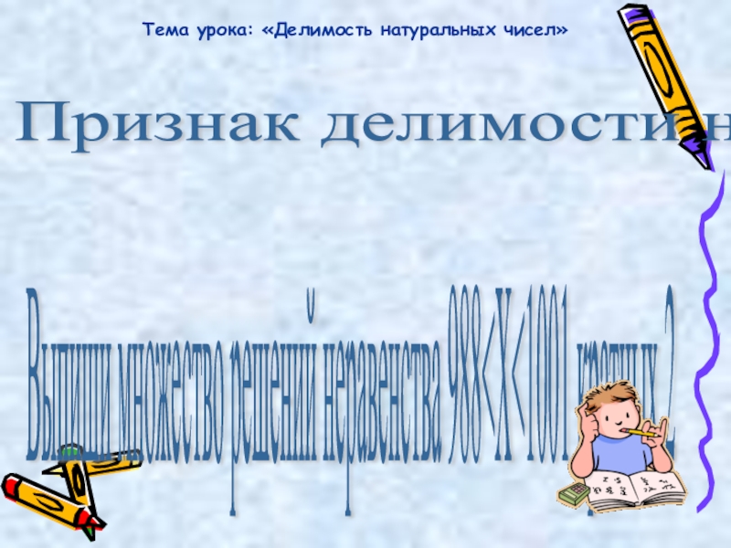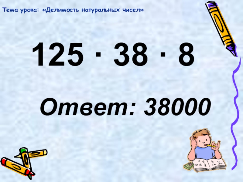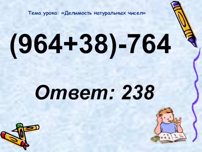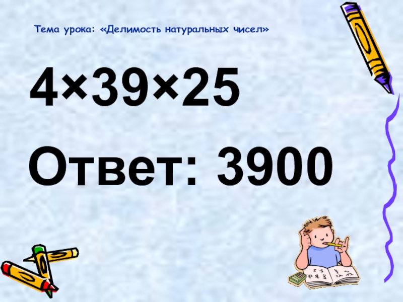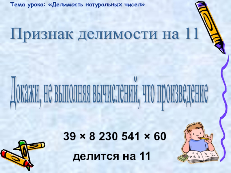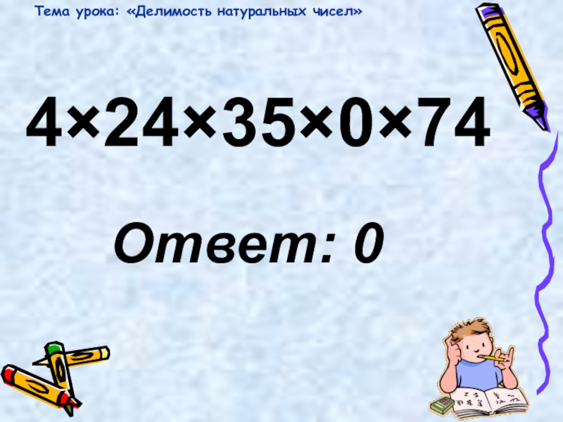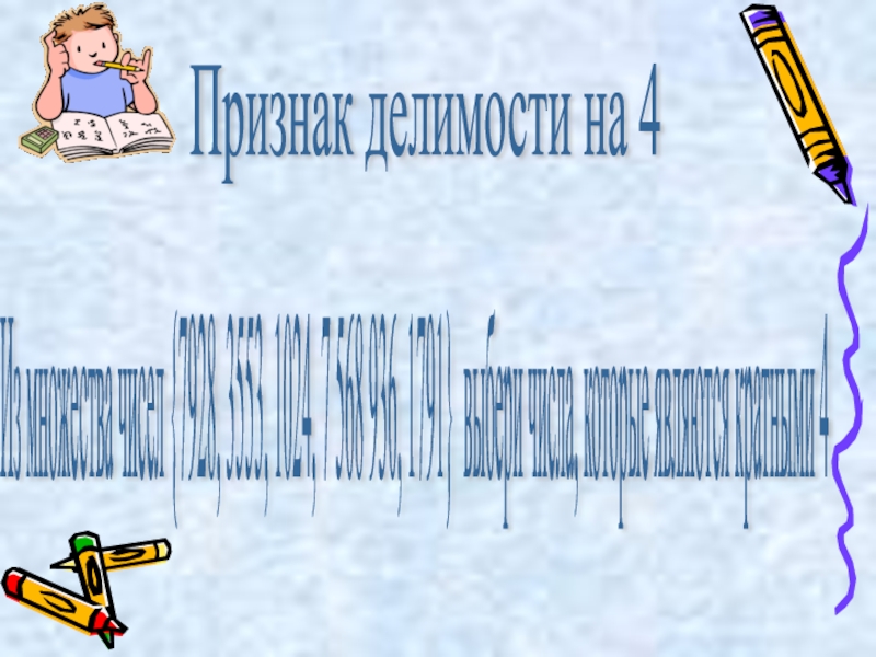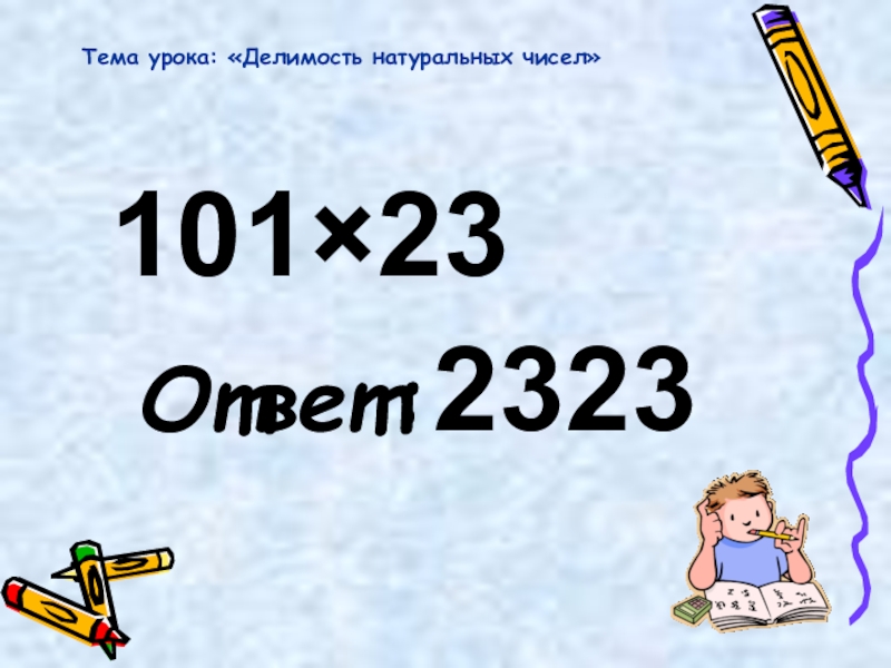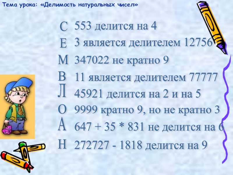 С 553 делится на 4 Е 3 является делителем 12756 М 347022 не кратно 9 В 11 является делителем 77777 Л 45921 делится на 2 и на 5 О 9999 кратно 9, но не кратно 3 А 647+35×831 не делится на 6 Н 272727-1818 делится на 9