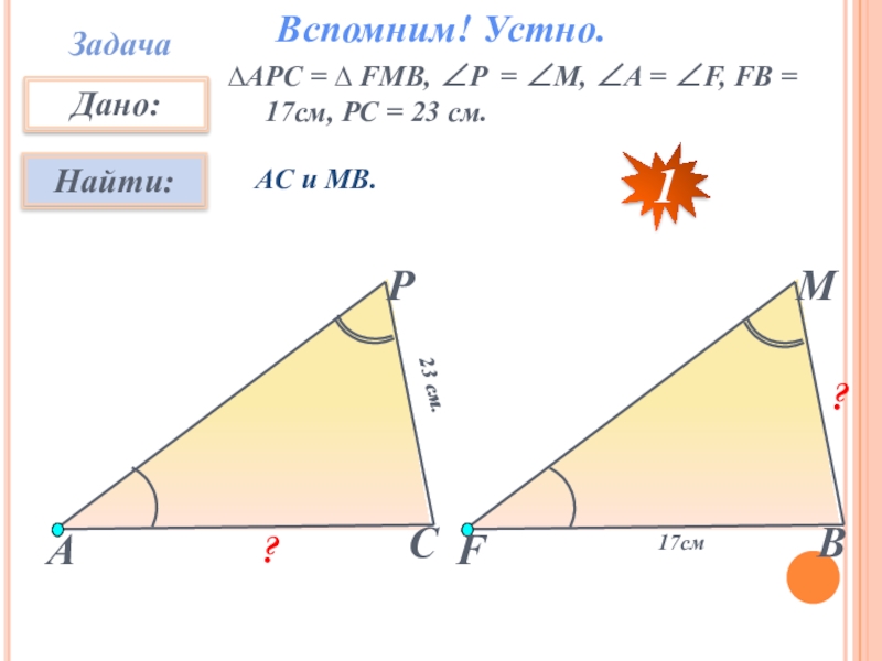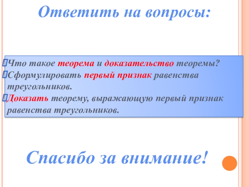 стороны и углы одного треугольника соответственно равны сторонам и углам другого треугольника.