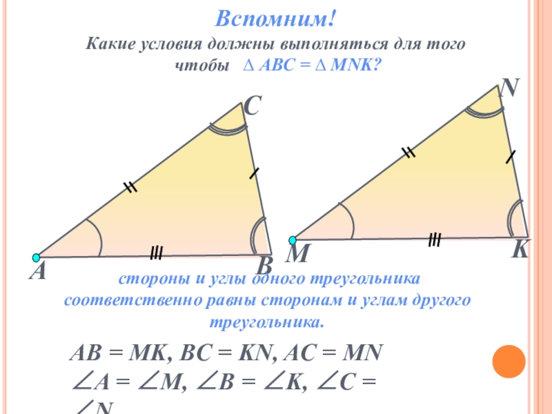 ∠A = ∠M, ∠B = ∠K, ∠C = ∠N.
