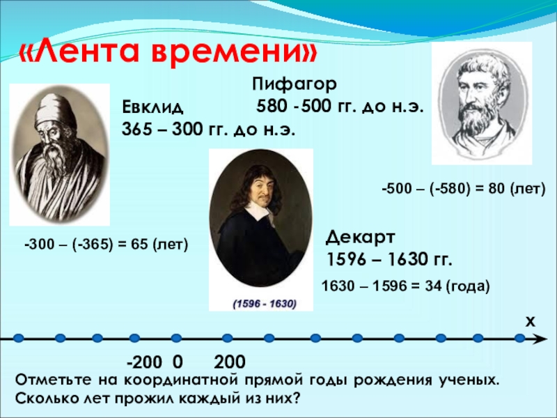 Отметьте на координатной прямой годы рождения ученых. Сколько лет прожил каждый из них?