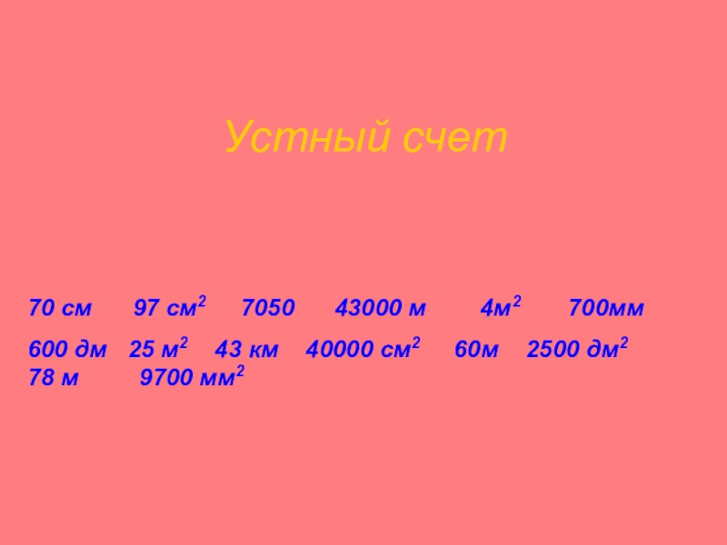 Устный счет70 см 97 см2 7050 43000 м 4м2 700мм 600 дм 25 м2 43 км 40000 см2 60м