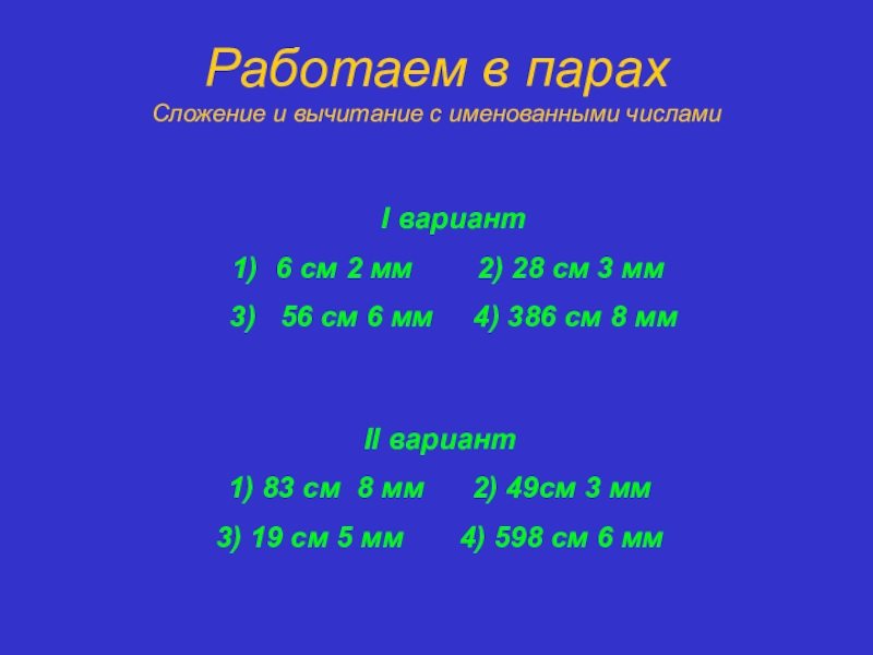 Работаем в парах Сложение и вычитание с именованными числамиI вариант6 см 2 мм    2)