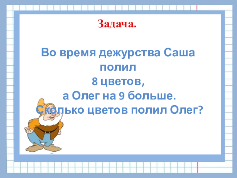 Задача.Во время дежурства Саша полил 8 цветов, а Олег на 9 больше. Сколько цветов полил Олег?