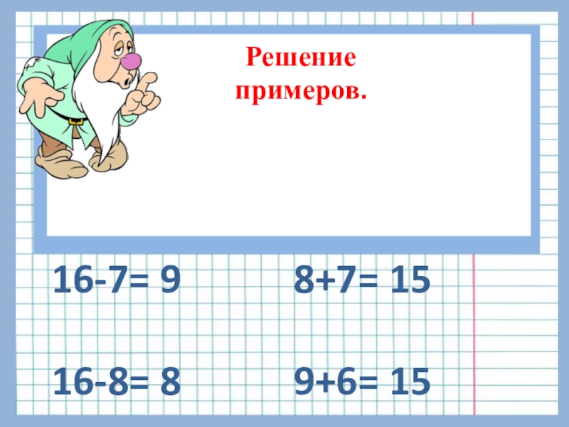 Решение примеров.16-7= 916-8= 88+7= 159+6= 15