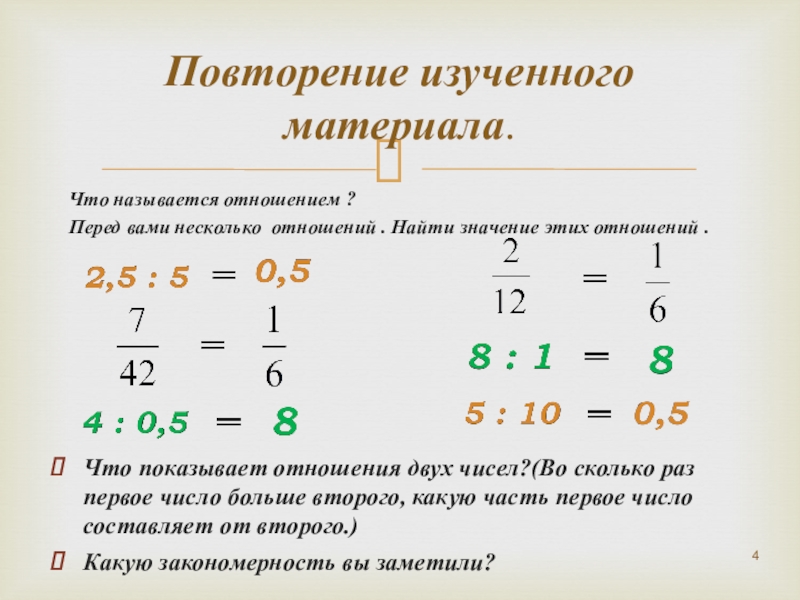 Что показывает отношения двух чисел?(Во сколько раз первое число больше второго, какую часть первое число составляет от второго.)