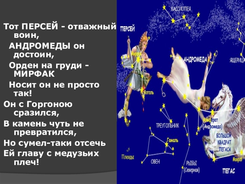 Тот ПЕРСЕЙ - отважный воин, АНДРОМЕДЫ он достоин, Орден на груди - МИРФАК Носит он не просто