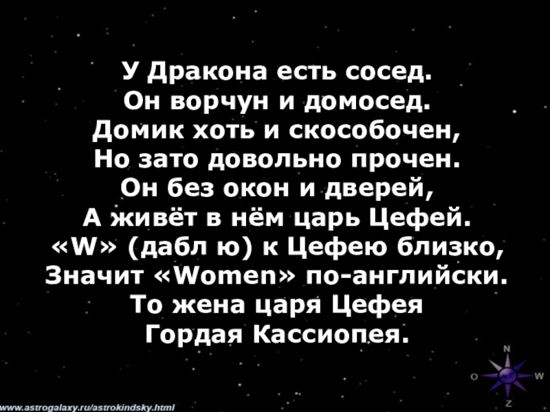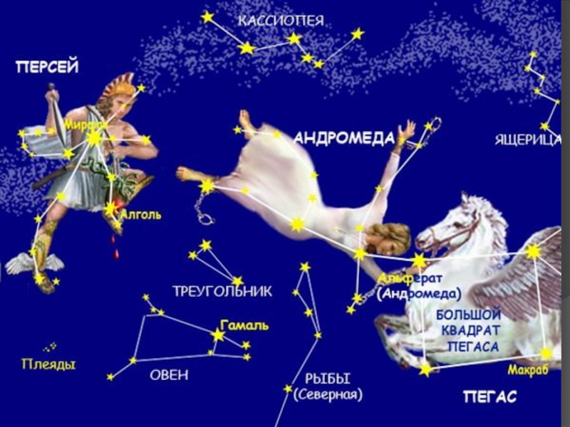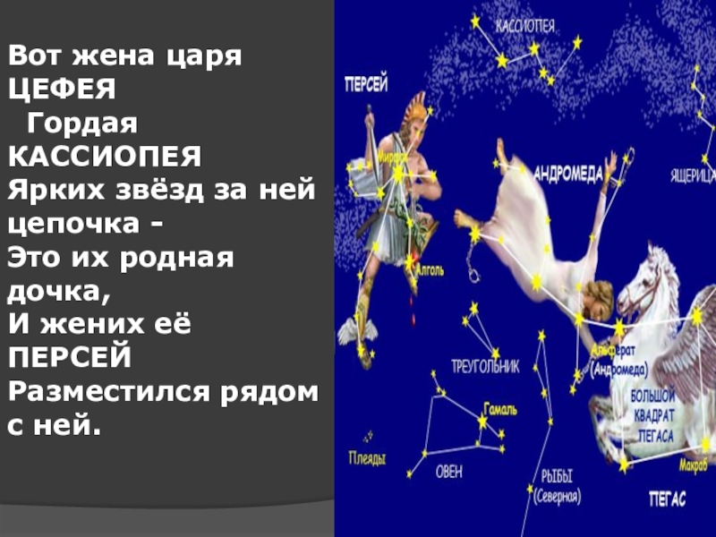 Вот жена царя ЦЕФЕЯ Гордая КАССИОПЕЯЯрких звёзд за ней цепочка -Это их родная дочка,И жених её ПЕРСЕЙРазместился