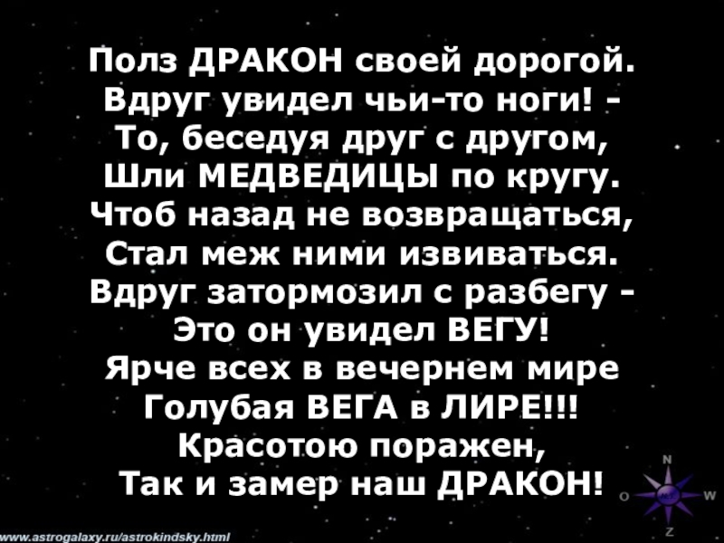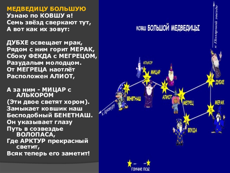 МЕДВЕДИЦУ БОЛЬШУЮУзнаю по КОВШУ я!Семь звёзд сверкают тут,А вот как их зовут: ДУБХЕ освещает мрак,Рядом с ним горит