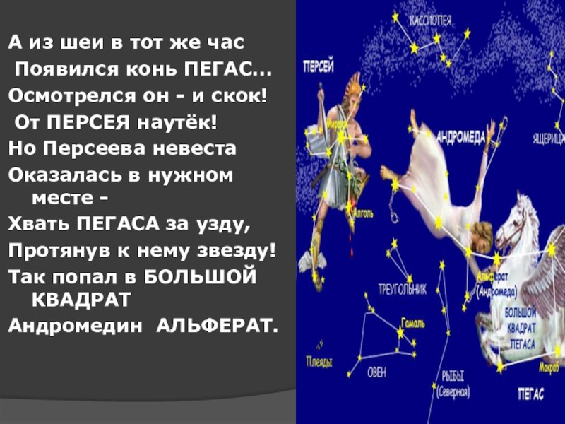 А из шеи в тот же час Появился конь ПЕГАС...Осмотрелся он - и скок! От ПЕРСЕЯ