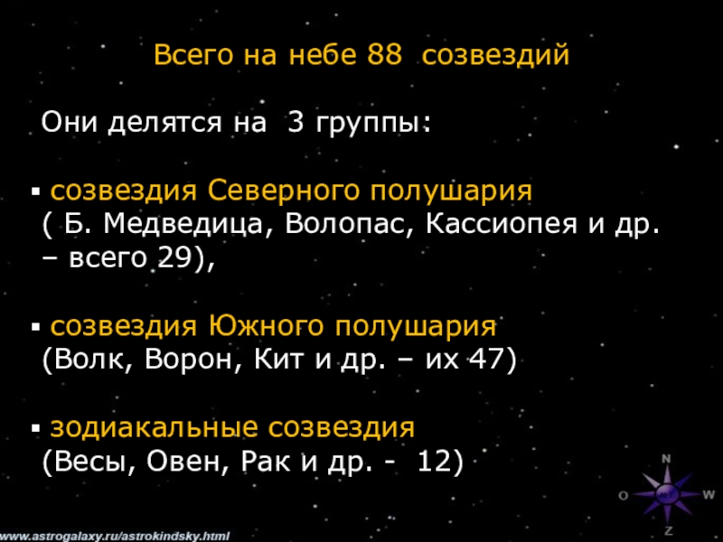 Всего на небе 88 созвездий Они делятся на 3 группы: созвездия Северного полушария ( Б. Медведица, Волопас, Кассиопея и др. – всего 29), созвездия Южного полушария (Волк, Ворон, Кит и др. – их 47) зодиакальные
