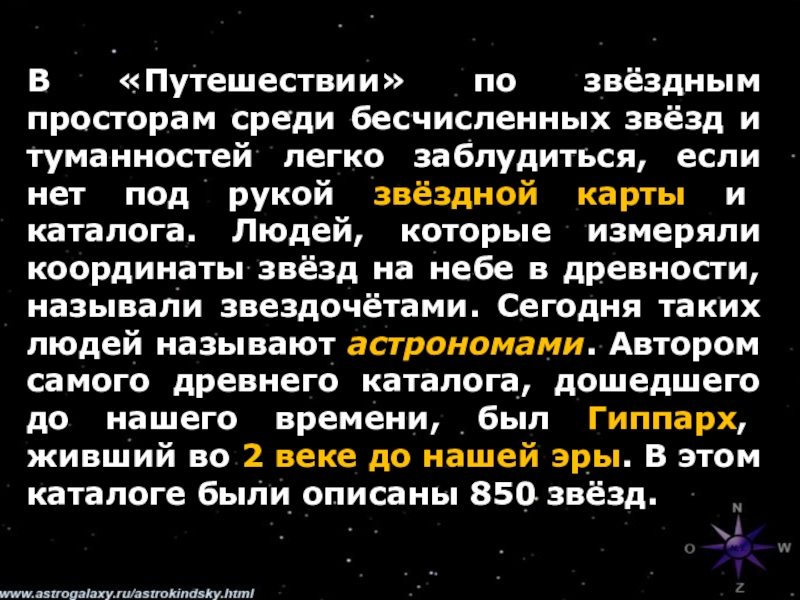 заблудиться, если нет под рукой звёздной карты и каталога. Людей, которые измеряли координаты звёзд на небе в древности, называли звездочётами. Сегодня таких людей называют астрономами. Автором самого древнего каталога, дошедшего до нашего времени, был Гиппарх, живший во 2 веке до нашей эры. В этом каталоге были описаны 850 звёзд.