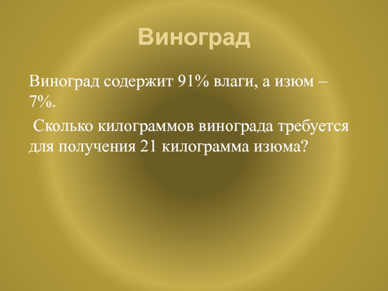 и изюме. Пусть для получения 21 килограмма изюма требуется х кг винограда. Из условия следует, что масса “сухого” вещества в х кг винограда равна 0,09х кг. Поскольку эта масса равна массе “сухого” вещества в 21 кг изюма, то по условию задачи можно составить уравнение