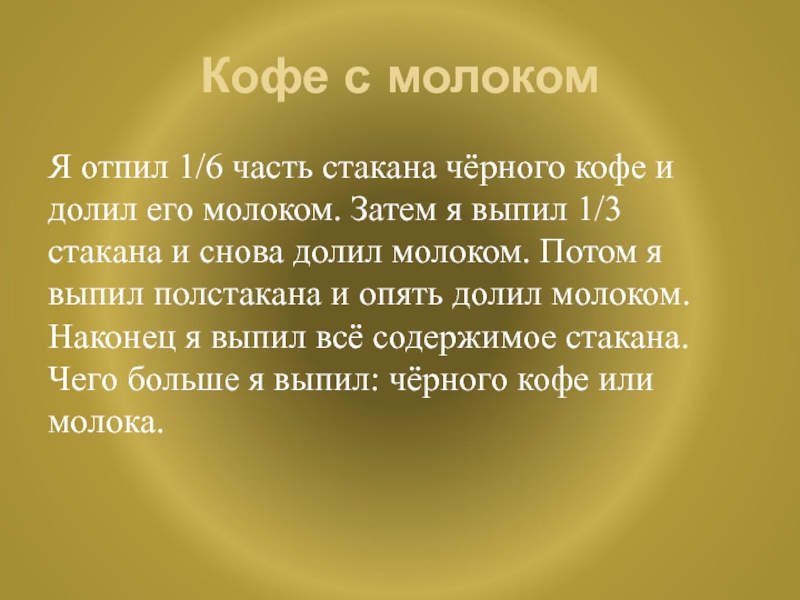 его молоком. Затем я выпил 1/3 стакана и снова долил молоком. Потом я выпил полстакана и опять долил молоком. Наконец я выпил всё содержимое стакана. Чего больше я выпил: чёрного кофе или молока.