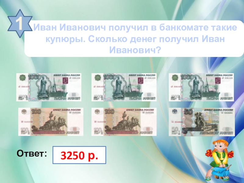 Иван Иванович получил в банкомате такие купюры. Сколько денег получил Иван Иванович?