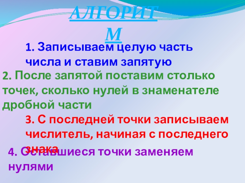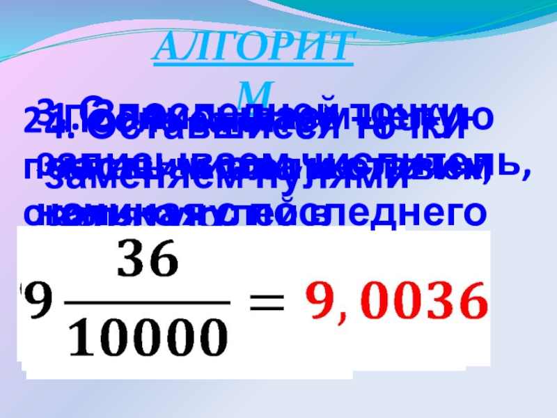 2. После запятой поставим столько точек, сколько нулей в знаменателе дробной части