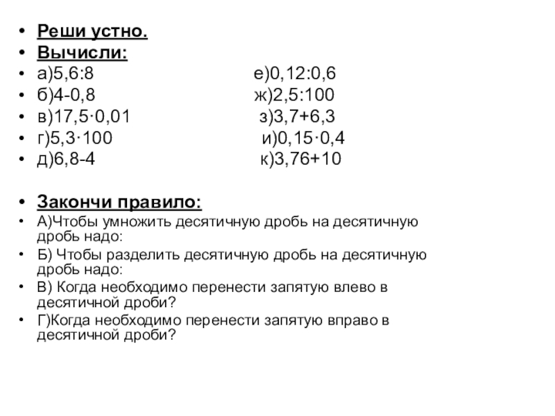 Б) Чтобы разделить десятичную дробь на десятичную дробь надо: