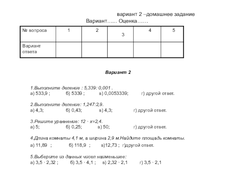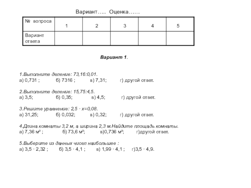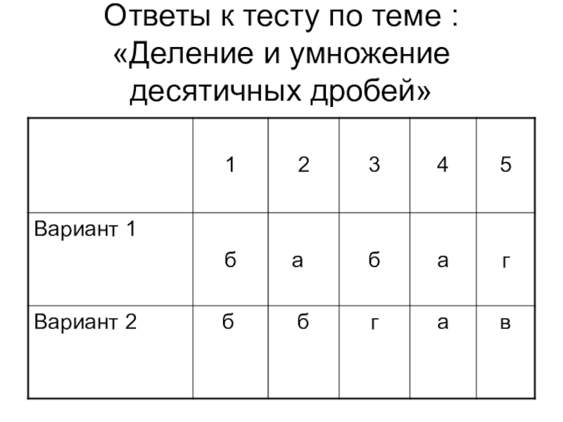 Слайд 13Ответы к тесту по теме : «Деление и умножение десятичных дробей»