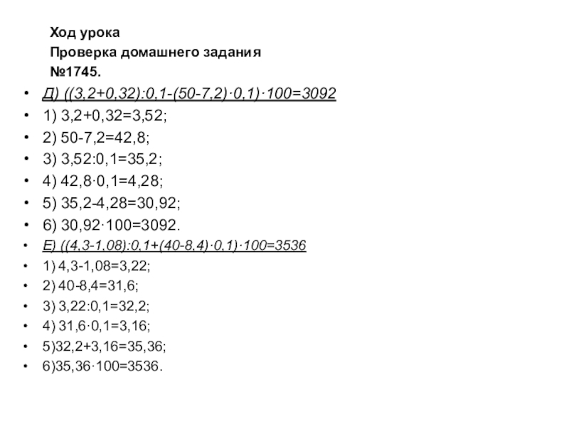 Д) ((3,2+0,32):0,1-(50-7,2)·0,1)·100=3092