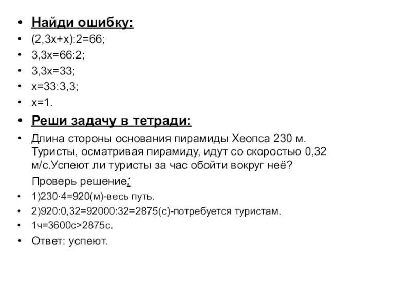 осматривая пирамиду, идут со скоростью 0,32 м/с.Успеют ли туристы за час обойти вокруг неё? Проверь решение:
