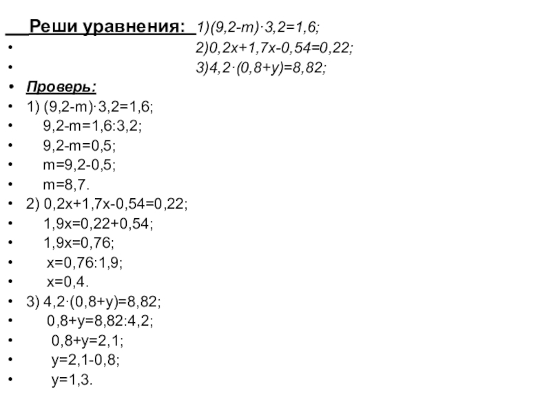 Слайд 8 Реши уравнения: 1)(9,2-m)·3,2=1,6;