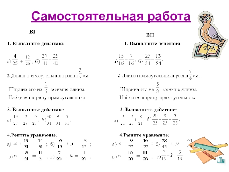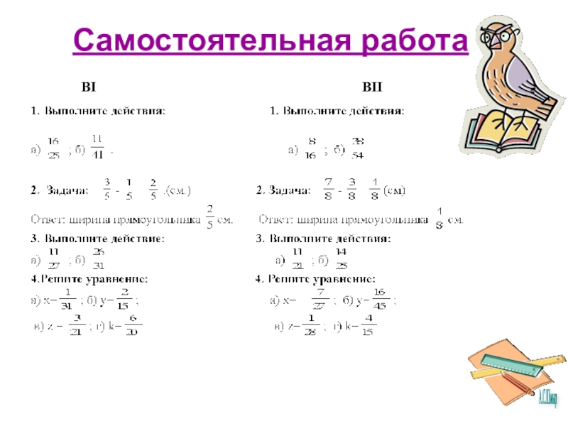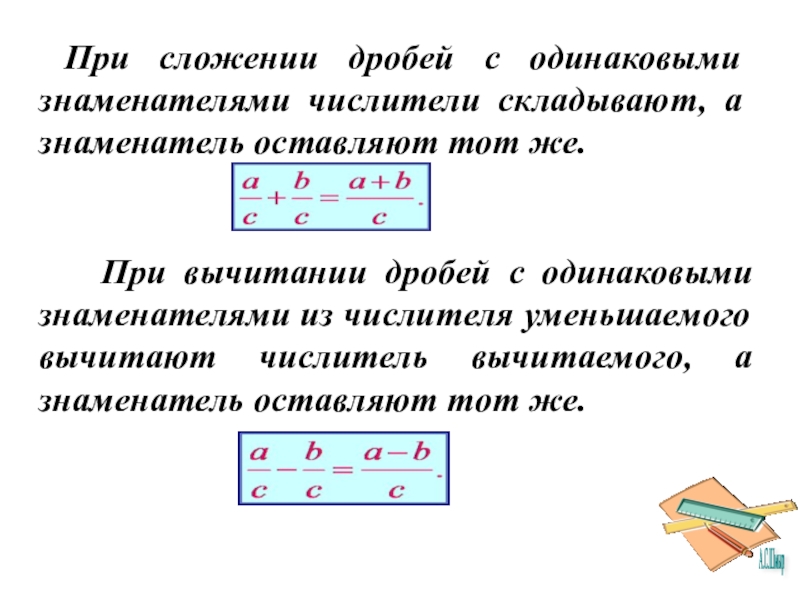 При вычитании дробей с одинаковыми знаменателями из числителя уменьшаемого вычитают числитель вычитаемого, а знаменатель оставляют тот же.