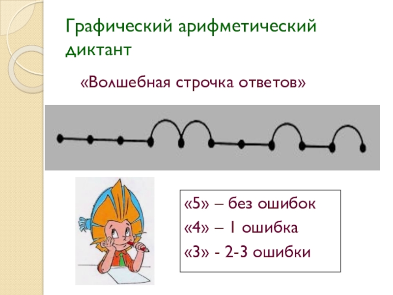 «Волшебная строчка ответов»Графический арифметический диктант«5» – без ошибок «4» – 1 ошибка«3» - 2-3 ошибки
