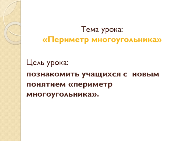 Тема урока: «Периметр многоугольника»Цель урока: познакомить учащихся с новым понятием «периметр многоугольника».