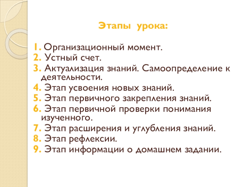 Этапы урока:1. Организационный момент.2. Устный счет.3. Актуализация знаний. Самоопределение к деятельности.4. Этап усвоения новых знаний.5. Этап первичного