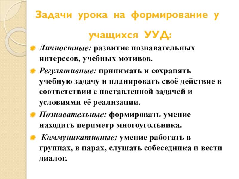 Задачи урока на формирование у  учащихся УУД:Личностные: развитие познавательных интересов, учебных мотивов.Регулятивные: принимать и сохранять учебную