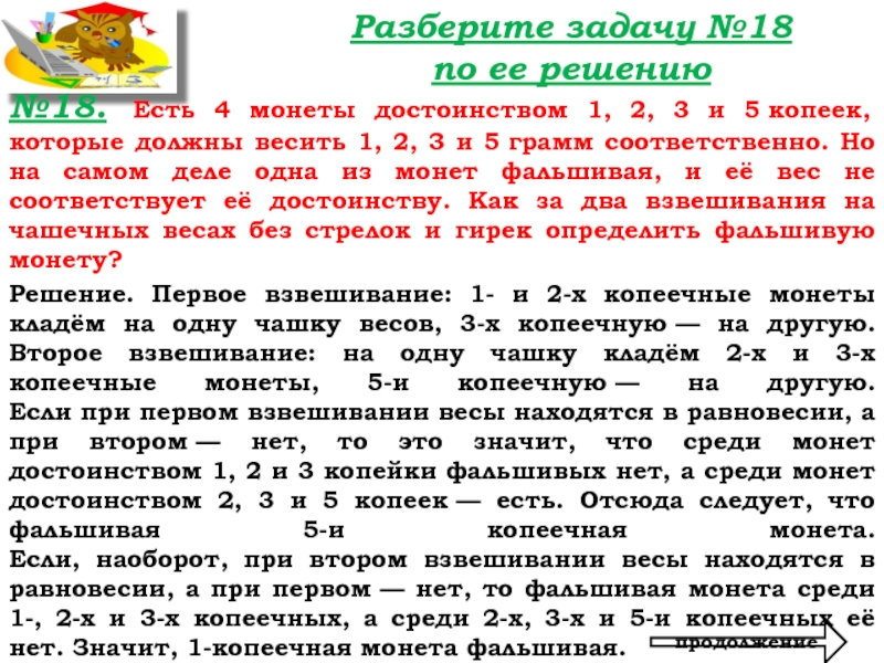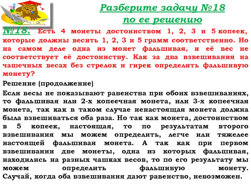 Если, наоборот, при втором взвешивании весы находятся в равновесии, а при первом — нет, то фальшивая монета среди 1-, 2-х и 3-х копеечных, а среди 2-х, 3-х и 5-и копеечных её нет. Значит, 1-копеечная монета фальшивая.