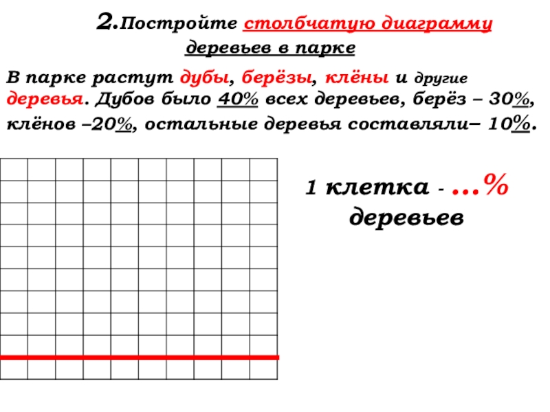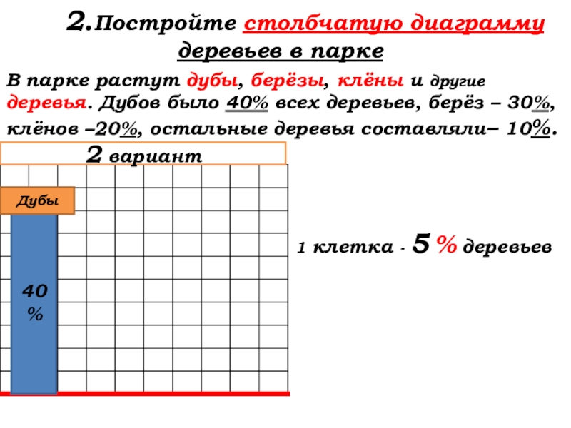 Дубов было 40% всех деревьев, берёз – 30%, клёнов – 20%, остальные деревья составляли– 10%.