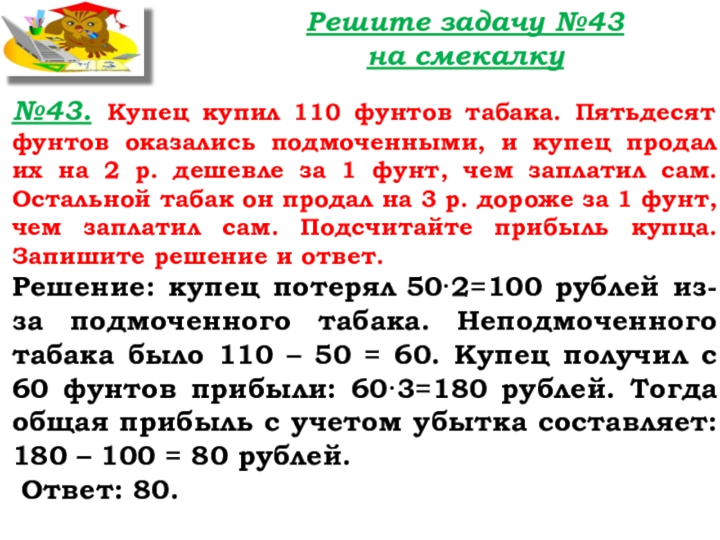 Решение: купец потерял 50·2=100 рублей из-за подмоченного табака. Неподмоченного табака было 110 – 50 = 60. Купец получил с 60 фунтов прибыли: 60·3=180 рублей. Тогда общая прибыль с учетом убытка составляет: 180 – 100 = 80 рублей.