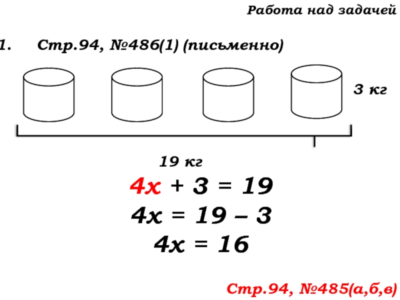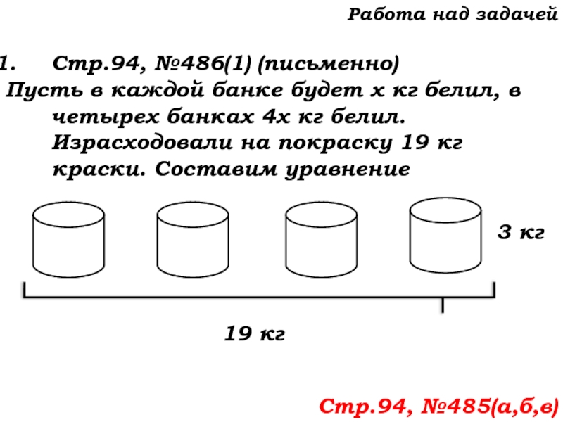 белил, в четырех банках 4х кг белил. Израсходовали на покраску 19 кг краски. Составим уравнение