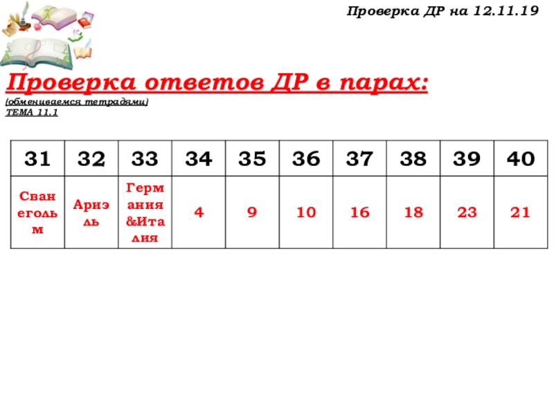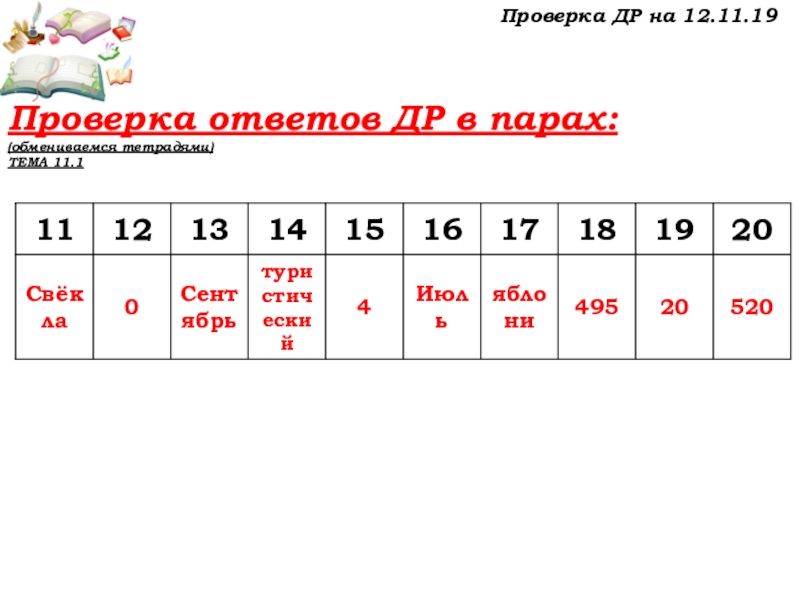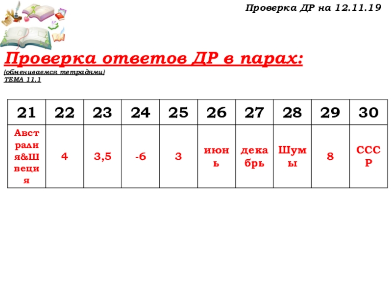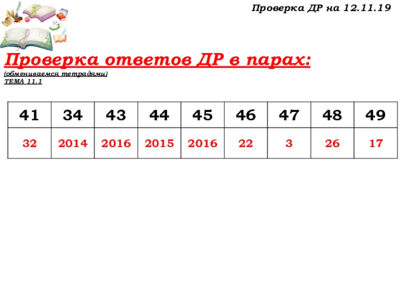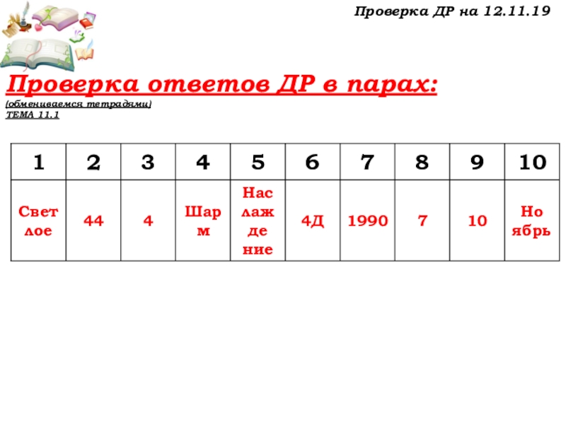 Проверка ДР на 12.11.19Проверка ответов ДР в парах:(обмениваемся тетрадями)ТЕМА 11.1