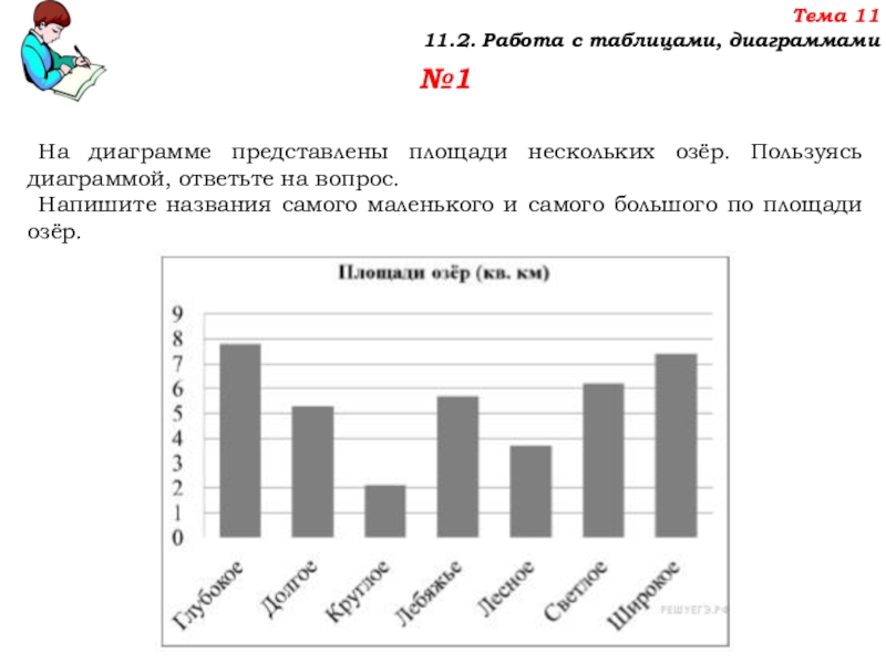 Тема 1111.2. Работа с таблицами, диаграммами№1На диаграмме представлены площади нескольких озёр. Пользуясь диаграммой, ответьте на вопрос.Напишите названия