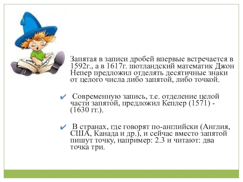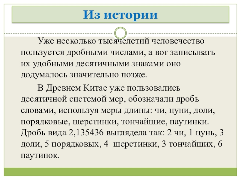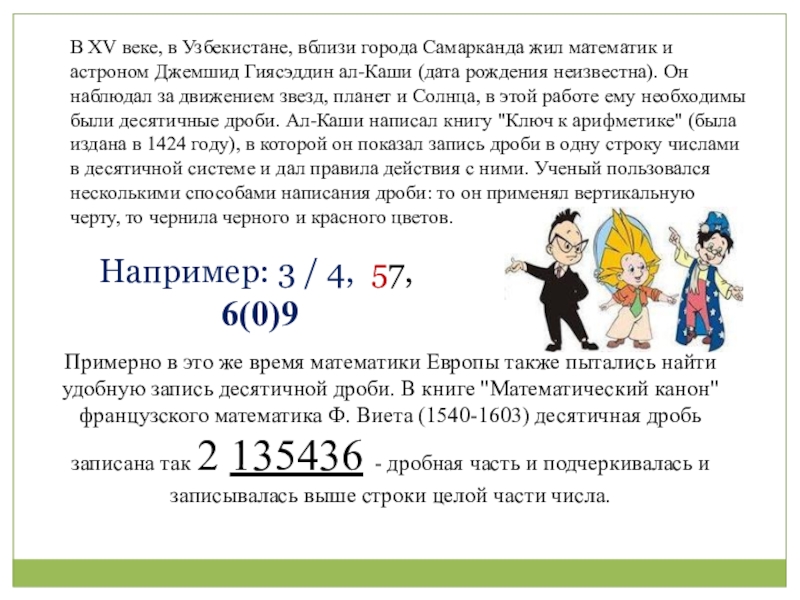 Примерно в это же время математики Европы также пытались найти удобную запись десятичной дроби. В книге "Математический канон" французского математика Ф. Виета (1540-1603) десятичная дробь записана так 2 135436 - дробная часть и подчеркивалась и записывалась выше строки целой части числа.