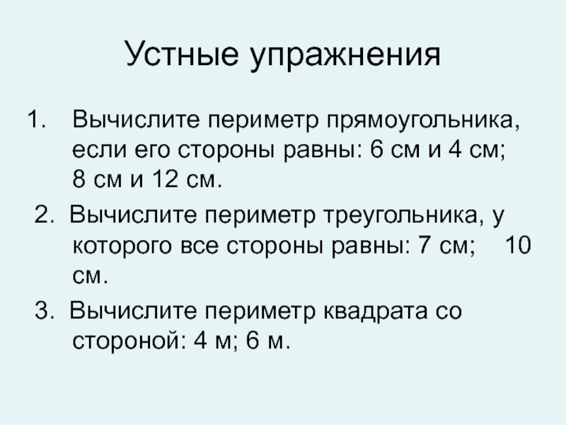 Устные упражнения Вычислите периметр прямоугольника, если его стороны равны: 6 см и 4 см; 8 см и 12 см. 2. Вычислите периметр треугольника, у которого все стороны равны: 7 см; 10 см.3. Вычислите