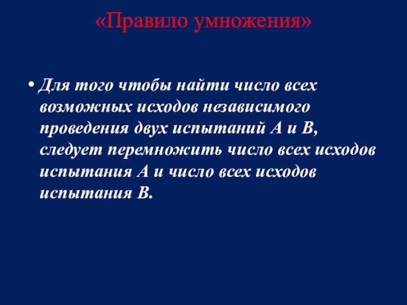 двух испытаний А и В, следует перемножить число всех исходов испытания А и число всех исходов испытания В.