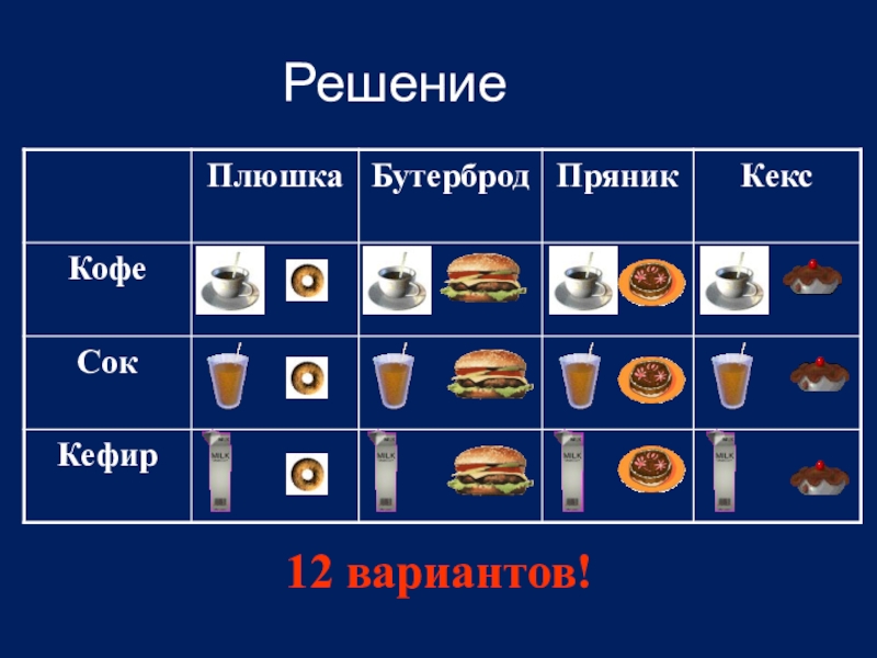 кекс, а запить их он может кофе, соком или кефиром. Из скольких вариантов завтрака Вова может выбрать?»