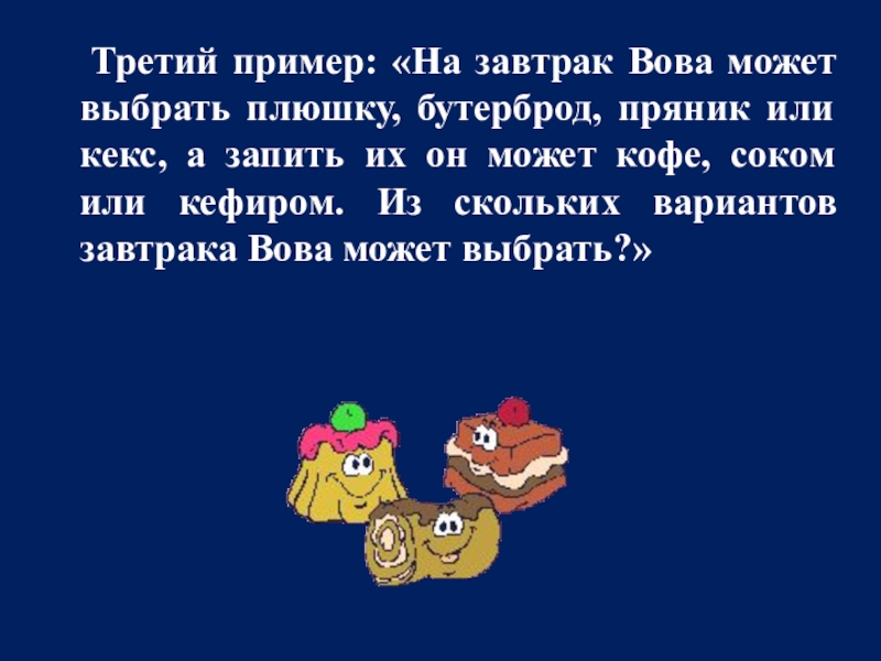 Слайд 5 Третий пример: «На завтрак Вова может выбрать плюшку, бутерброд, пряник или