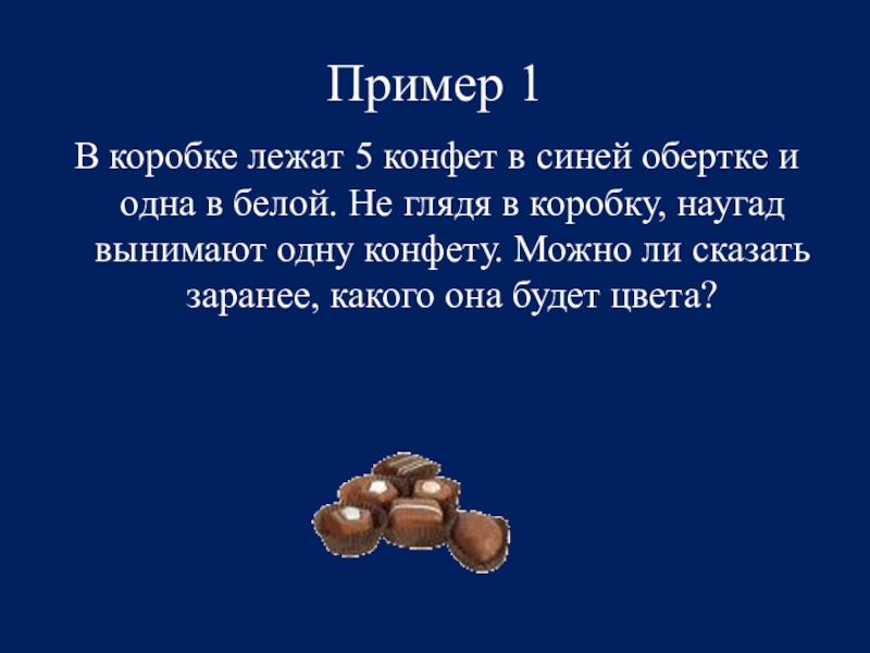 в белой. Не глядя в коробку, наугад вынимают одну конфету. Можно ли сказать заранее, какого она будет цвета?