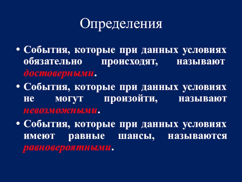 События, которые при данных условиях обязательно происходят, называют достоверными.