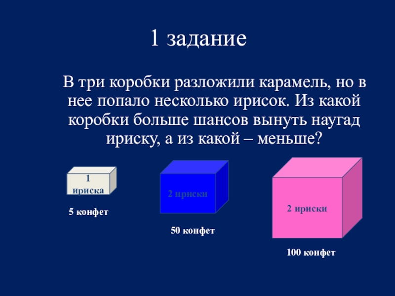 попало несколько ирисок. Из какой коробки больше шансов вынуть наугад ириску, а из какой – меньше?