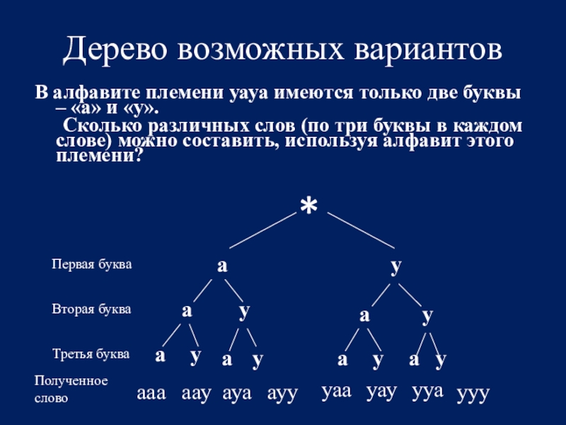 выходя за рамки плоскости, с помощью геометрической модели, которую называют деревом возможных вариантов. Она, во-первых, наглядна, как всякая картинка, и, во-вторых, позволяет все учесть, ничего не пропустив.